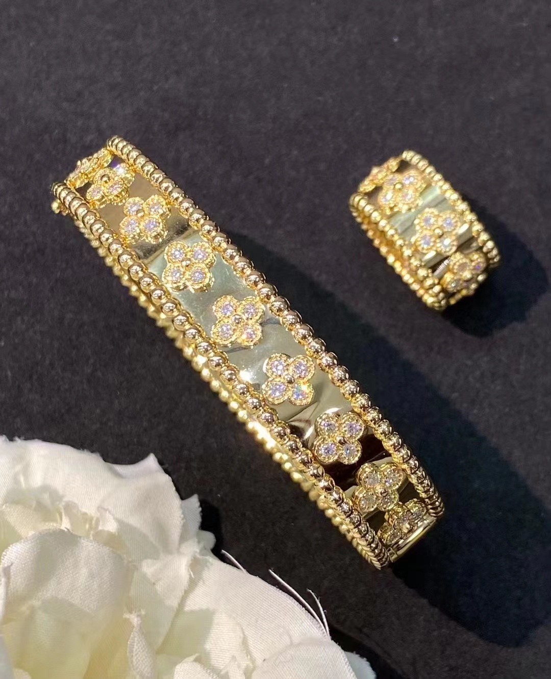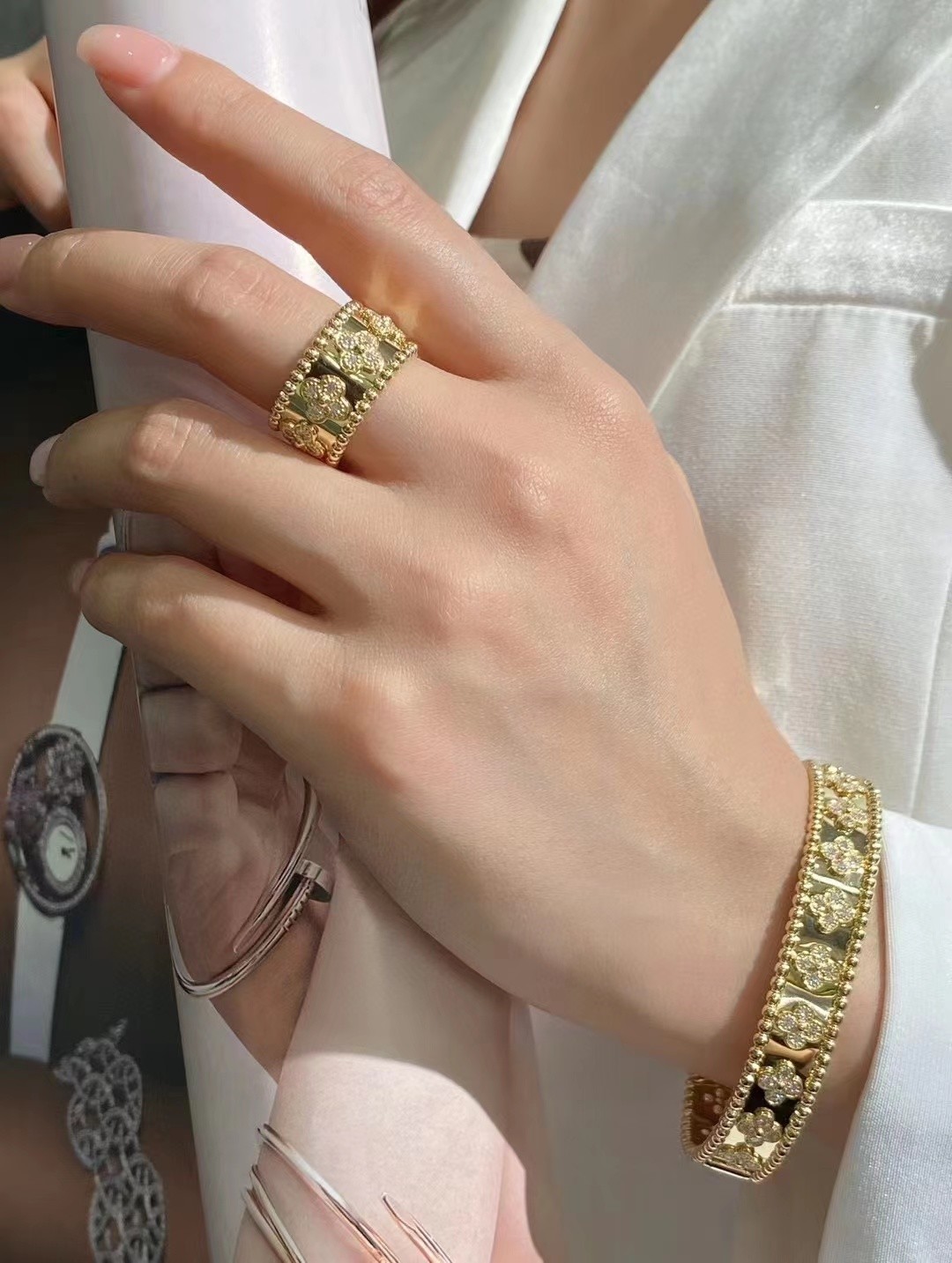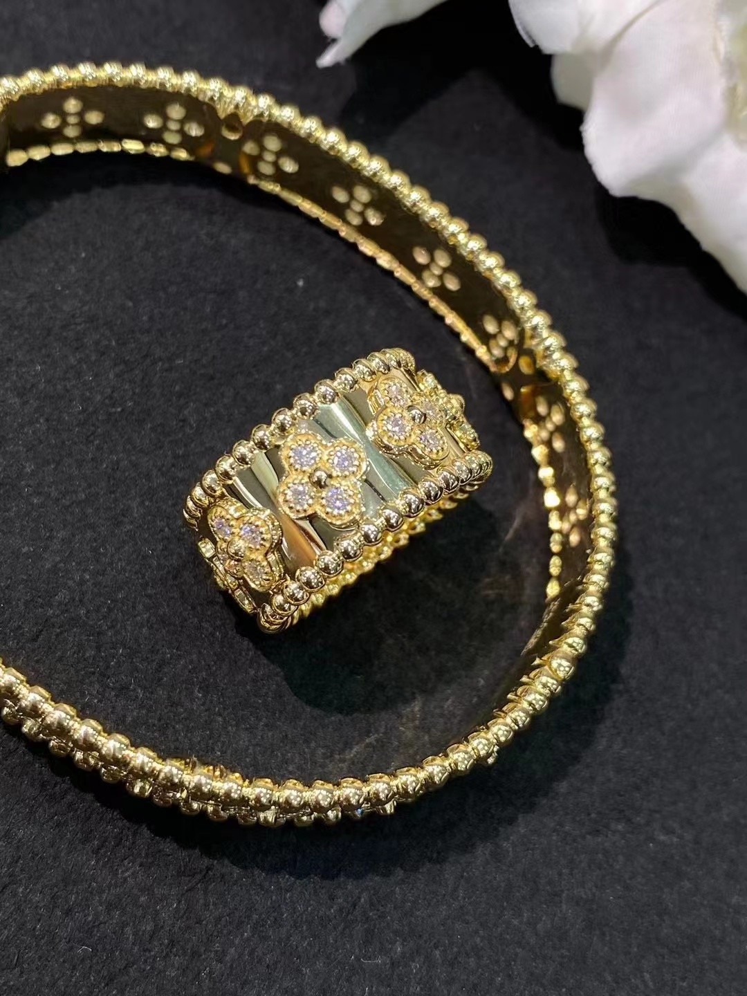 Творения в коллекции клеветок PerléeTM украшены драгоценными мотивами клевера "Custom Brand", символом удачи.
